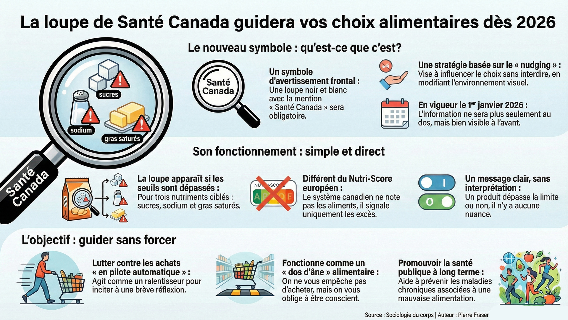 À partir de janvier 2026, Santé Canada affichera une loupe sur les aliments riches en sucre, sel ou gras, guidant moralement chaque achat vers la prudence.