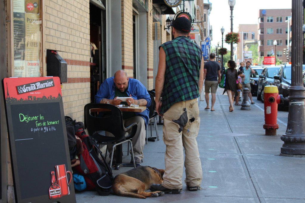 Cette photo, prise par Pierre Fraser sur la rue Saint-Joseph dans le quartier Saint-Roch de la ville de Québec, ressemble à une petite fable urbaine dont on connaît tous les personnages, même si l’on préfère parfois ne pas les regarder trop longtemps. Un dimanche matin de juillet 2018, la lumière est parfaite, les terrasses sont pleines, le brunch est devenu un rite quasi civique et chacun occupe la place que la ville lui a assignée avec une remarquable discipline. La rue n’est pas seulement un décor, elle est un plan de distribution sociale à ciel ouvert, avec ses zones autorisées, ses marges tolérées et ses frontières invisibles mais solidement gardées.