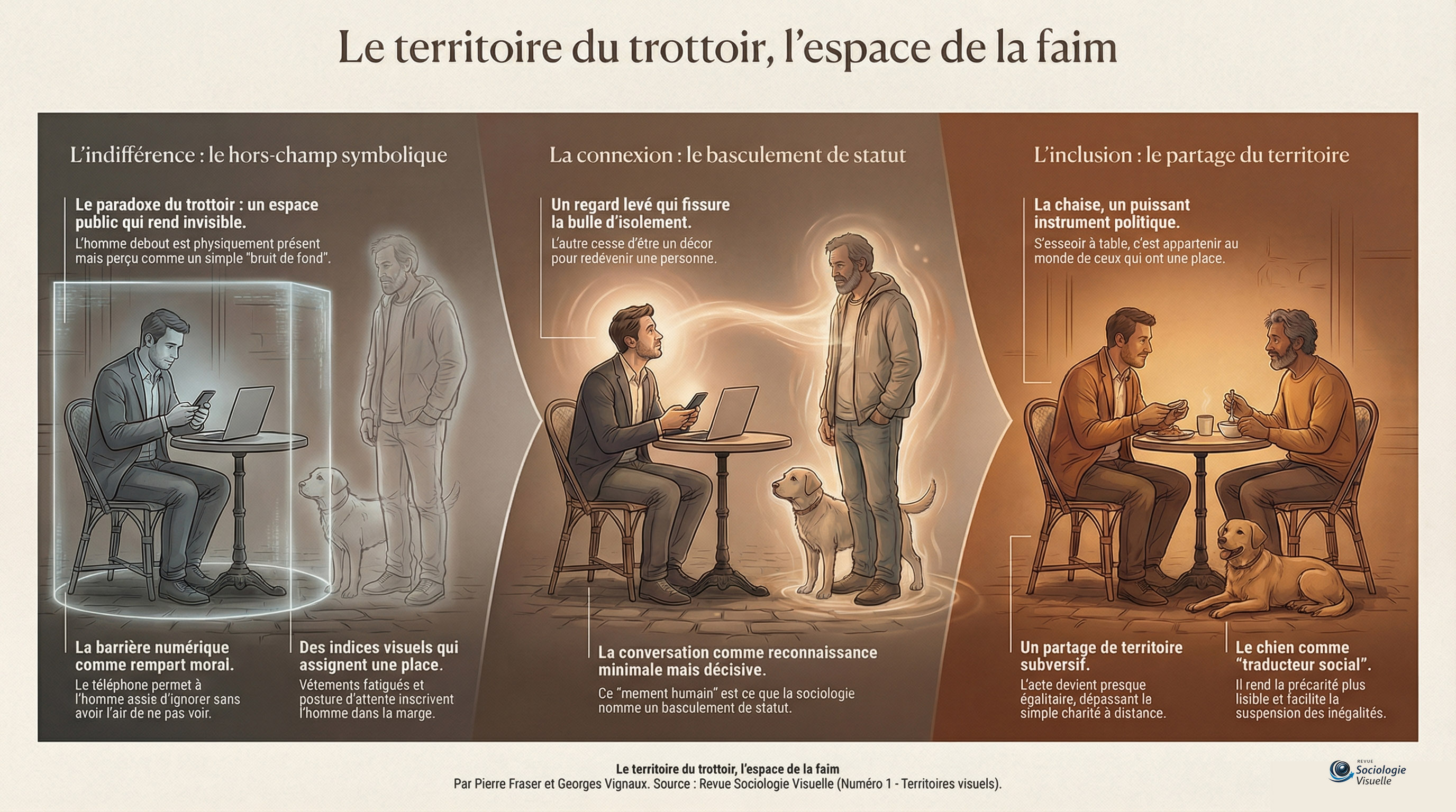 Au départ, l’homme debout appartient clairement au hors-champ symbolique. Il est là, mais comme on dit d’un bruit de fond qu’il finit par ne plus s’entendre. Ses vêtements fatigués, sa posture d’attente et sa présence immobile l’inscrivent dans le territoire du trottoir, cet espace paradoxalement public où certaines existences deviennent presque privées de regard. Face à lui, le client assis incarne la normalité urbaine accomplie, celle qui a une table, un écran, un repas et surtout une bonne raison de ne pas lever les yeux. Le téléphone joue ici un rôle admirable, à la fois objet utile et rempart moral, permettant de ne pas voir sans avoir l’air d’ignorer.