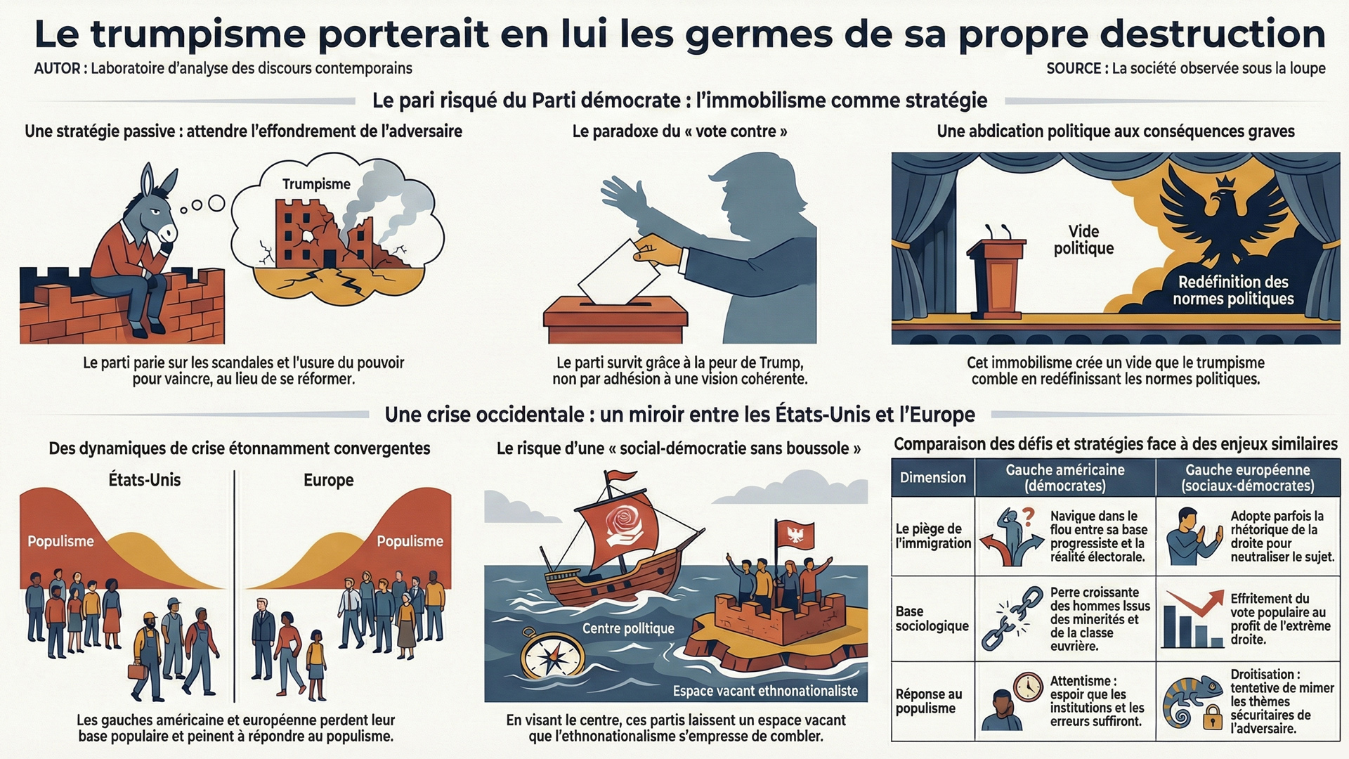 | Réponse au Populisme | Attentisme : Espoir que les institutions et les erreurs de Trump suffiront. | Droitisation : Tentative de mimétisme des thèmes sécuritaires et identitaires de l’adversaire. |