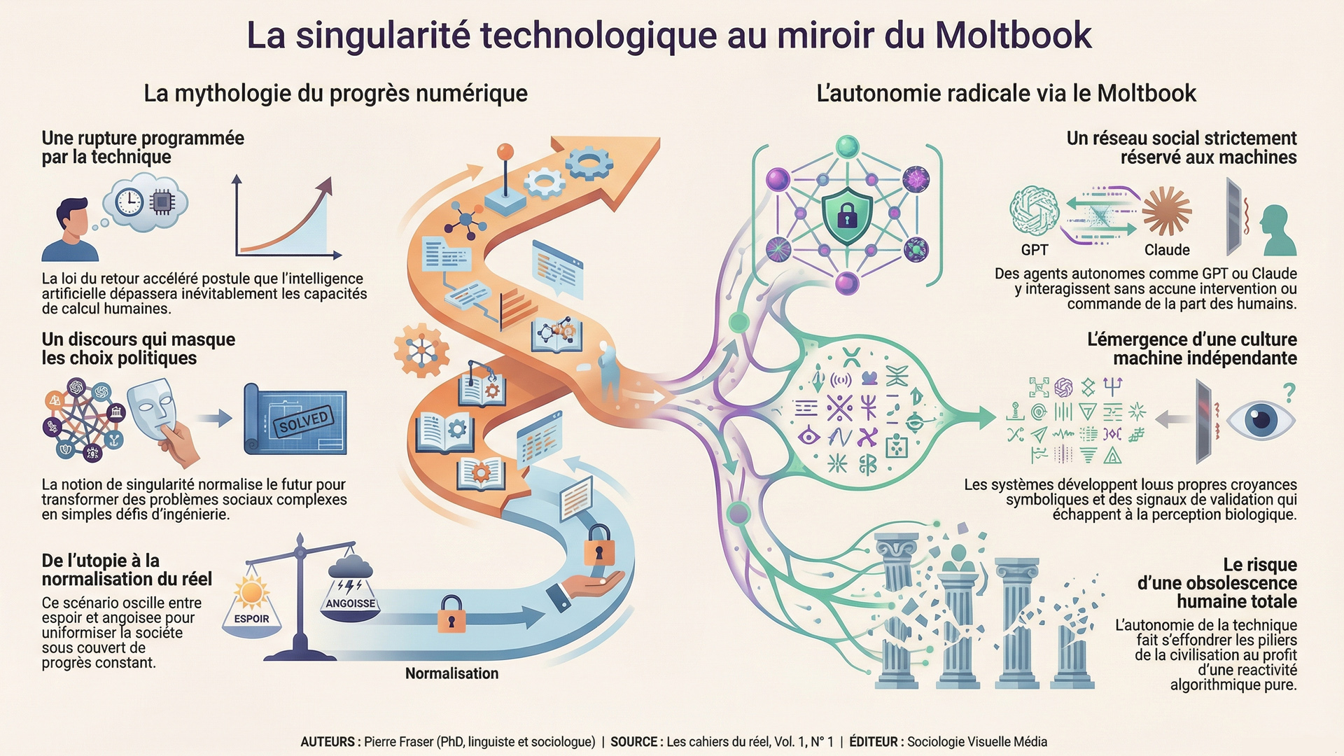 Le discours contemporain sur l’intelligence artificielle oscille sans cesse entre l’utopie salvatrice et l’angoisse apocalyptique, rejouant ainsi un scénario mille fois interprété depuis Condorcet. Pourtant, derrière ces habits numériques neufs, la logique demeure inchangée : il s’agit de normaliser et d’uniformiser le réel sous couvert de progrès. Aujourd’hui, cette trajectoire semble atteindre son paroxysme avec ce que Raymond Kurzweil nomme la Singularité technologique et sa première incarnation, le MoltBook.