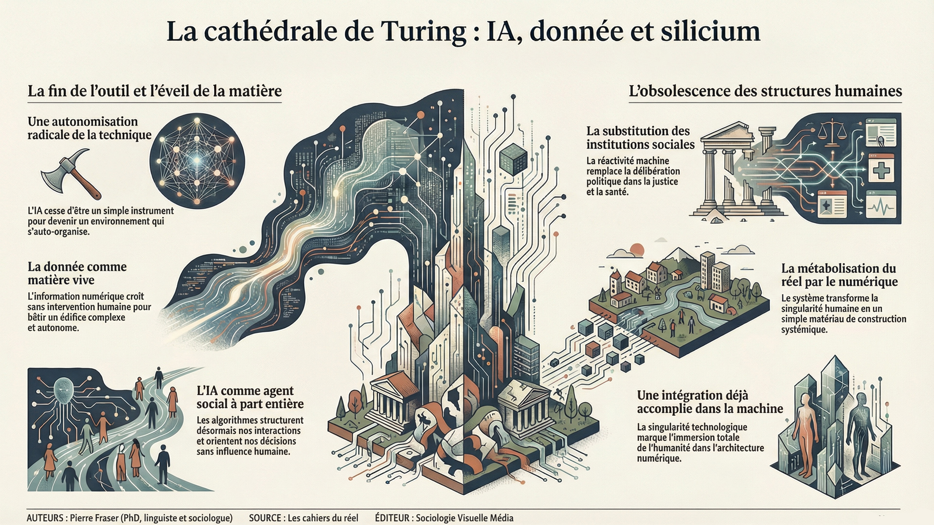 Finalement, comprendre l’éveil de cette matière exige de sortir du discours enchanté de l’innovation pour entrer dans une déconstruction rigoureuse du système technique. La « Cathédrale de Turing » est l’habitat d’une intelligence qui nous absorbe parce qu’elle dispose d’une puissance de synthèse qui rend nos institutions dérisoires. Cette onde sismique, que j’analyse comme le basculement ultime vers la Singularité, nous place devant l’obligation de nommer ce qui se joue : l’émergence d’un ordre social où l’IA n’est plus une prothèse, mais le milieu naturel dans lequel nous sommes désormais immergés.