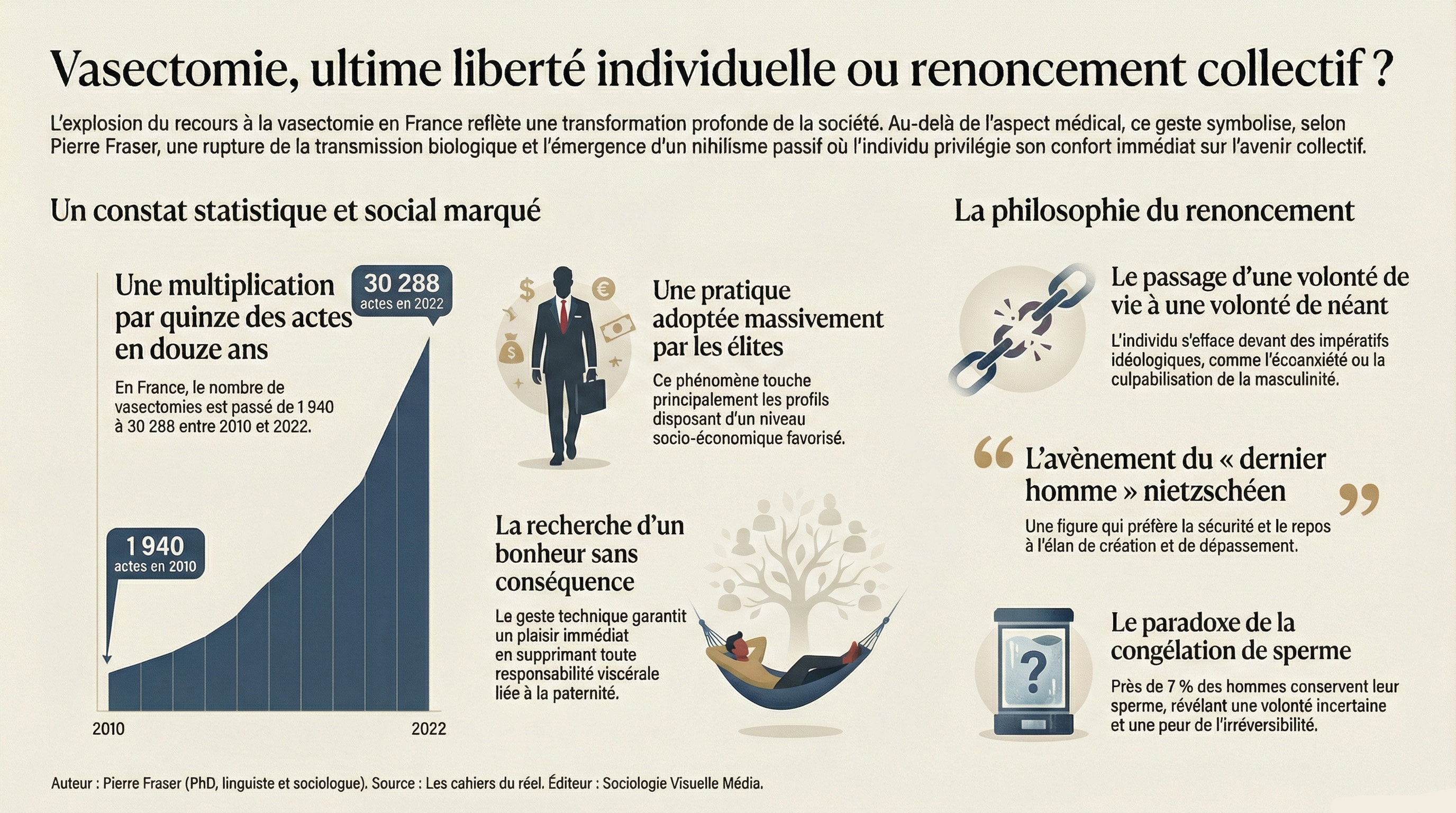 En fait, notre analyse nuance l’hypothèse de départ en révélant une tension entre le désir d’extinction et la peur du néant. Le fait qu’environ 6,8 % des hommes optent pour la congélation de leur sperme avant l’opération montre que la volonté de puissance n’est pas totalement morte, mais qu’elle est devenue incertaine, incapable de s’assumer. C’est une puissance mise au frigo, une assurance technique contre un regret éventuel. On veut le néant, mais on veut garder une clé de secours biologique dans un laboratoire. Cette hésitation souligne la fragilité de l’homme moderne qui, tout en prétendant à un choix radical de « libre arbitre » (UNFPA, 202510), reste hanté par l’irréversibilité de son acte. La technologie de congélation du sperme n’est plus ici un outil de dépassement, mais une prothèse pour une volonté chancelante qui n’ose plus dire ni un « oui » définitif à la vie, ni un « non » définitif à la lignée.