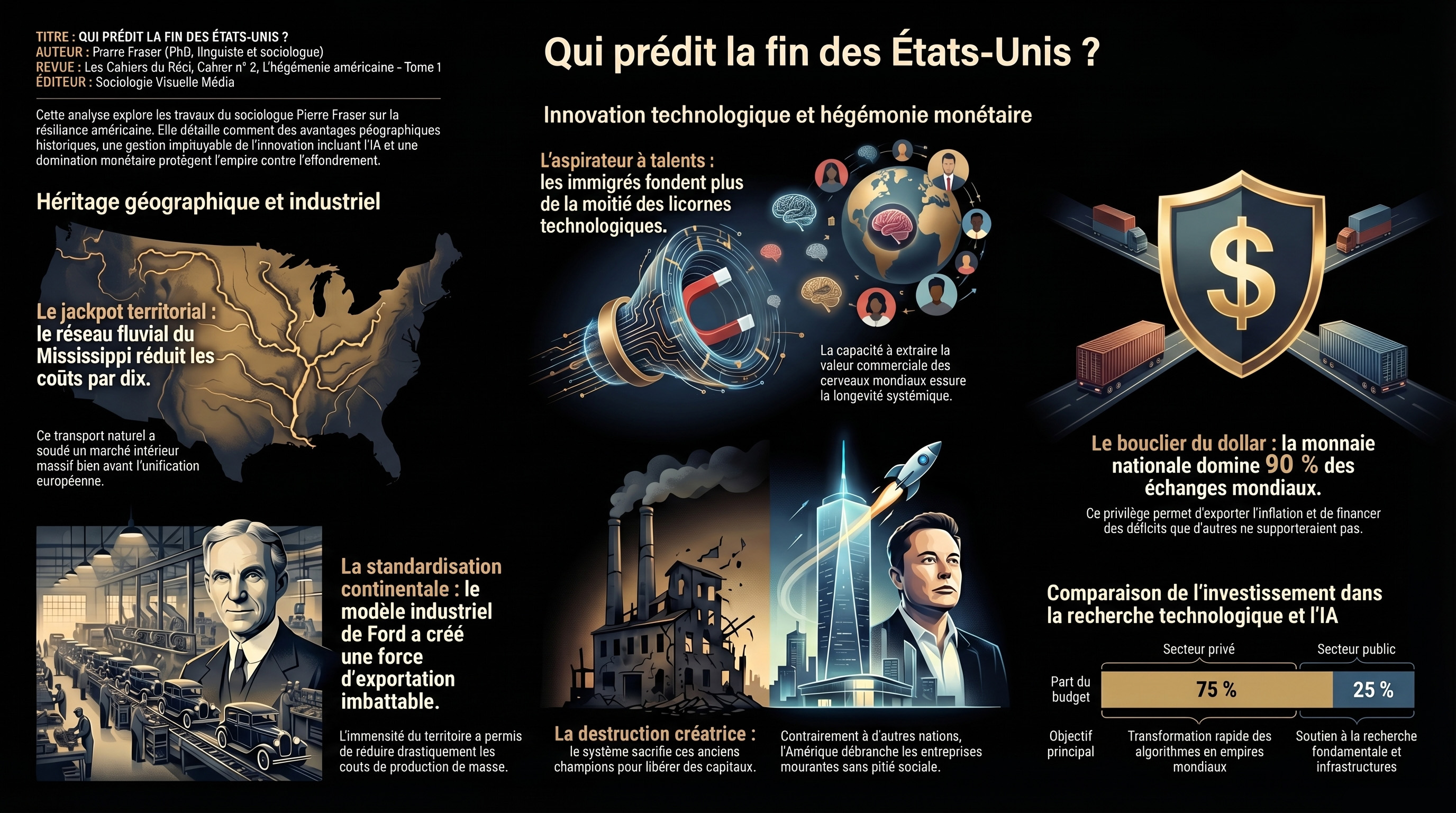 Enfin, il y a le dollar, ce « privilège exorbitant » qui permet aux États-Unis de se financer sur le dos du reste du monde alors même que leurs transactions n’ont rien à voir avec l’oncle Sam. Près de 90 % des échanges mondiaux impliquent la monnaie verte, offrant au pays un pouvoir unique de sanctions et de financement que la Chine tente désormais de contester avec une agressivité croissante. Le « boss final » de l’économie mondiale est arrivé, et la question n’est plus de savoir si les piliers américains sont solides, mais s’ils peuvent encore se réinventer dans un monde qui refuse de plus en plus leur hégémonie. Robert Gilpin, dans ses études sur les transitions hégémoniques, nous rappelle que chaque cycle finit par se heurter à un rival qui joue dans la même catégorie de poids, et c’est ce duel qui déterminera si l’anomalie américaine peut durer un siècle de plus.