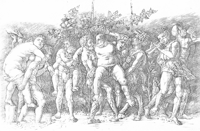 Le jugement sur le très gros, à la Renaissance, est sans équivoque. Tous les traités de physiognomonie qui circulent à l’époque, qui prétendent juger de la qualité d’un individu par ses traits, et qui associent grosseur à luxure, contribuent largement à cette idée. Le poète et humaniste italien Pomponius Gauricus (1481-1530) ira jusqu’à dire, dans son ouvrage De Sculptura, en 1504 : « Une poitrine obèse avec les mamelons pendants dénonce le débauché, l’ivrogne, le gourmand[5]. » La représentation du corps obèse dans la peinture se confirme tout d’abord avec le peintre Andrea Mantegna (1431-1506). Il y a là des peintures peuplées de « dieux grotesques, ivrognes, bagarreurs et obscènes flanqués de filles obèses qui vocifèrent. Le réalisme s’exaspère jusqu’au grotesque le plus cru, noir sur blanc, et netteté de bas-relief[6]. » Le peintre « fait explicitement référence au modèle du putto, aussi bien d’un point de vue formel qu’iconographique, pour élaborer sa propre typologie du personnage obèse, faute de modèle préexistant. Il reprend les bourrelets qui se succèdent sur le corps potelé des putti pour les transposer sur le corps adulte. Il parvient ainsi à illustrer, dans toute son ampleur, la gêne fonctionnelle qui emprisonne les corps […] de Silène et de la femme à gauche, puisqu’ils sont en effet totalement incapables de marcher[7]. »
