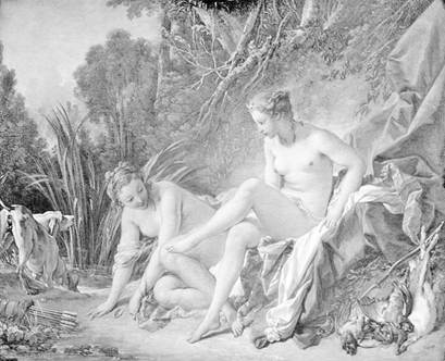 Diane sortant du bain, François Boucher, 1742 (Paris, musée du Louvre). Après la chasse, Diane se repose, assistée dans sa toilette par une nymphe. Créateur d’un type féminin ingénu et provocateur, sensuel et élégant, Boucher utilise ce sujet mythologique comme un hymne à la femme.